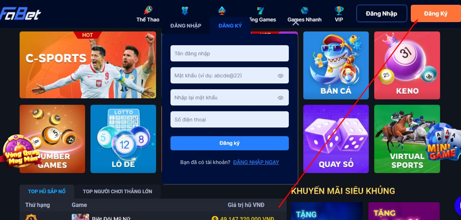 Click vào nút đăng ký ở góc phải màn hình để đăng ký FaBet