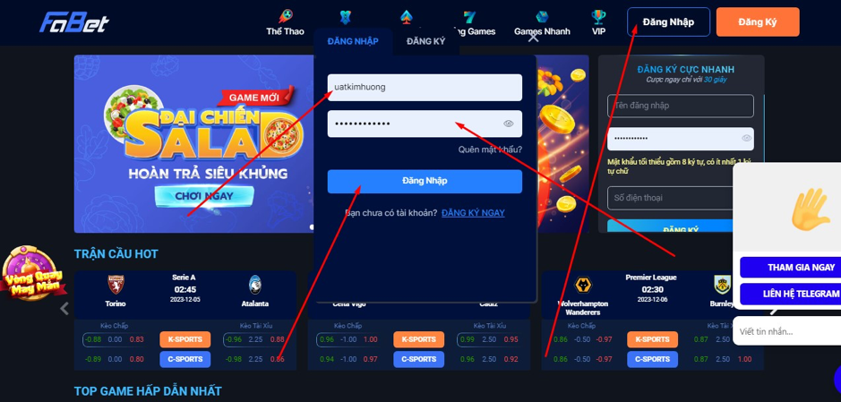 Điền thông tin acc, mật khẩu rồi nhấn đăng nhập để vào tài khoản FaBet