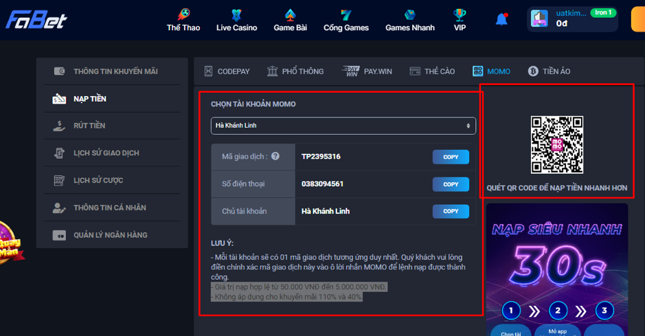 Lưu ý, hình thức nạp tiền MoMo có giá trị nạp hợp lệ từ 50.000 VNĐ đến 5.000.000 VNĐ. Đồng thời không áp dụng cho khuyến mãi 110% và 40%. Anh em chú ý để chọn phương thức gửi tiền có lợi nhất cho mình.