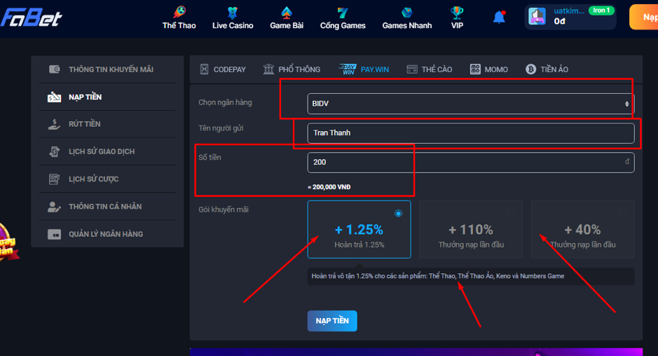 Hình thức nạp tiền Paywin tại FaBet hỗ trợ 4 ngân hàng gồm ACB, Sacombank, BIDV và Techcombank. Các anh em click chọn ngân hàng phù hợp rồi nhập họ tên người gửi, số tiền. Đặc biệt đừng quên chọn chương trình khuyến mãi đang được áp dụng như hình sau để nhận thưởng.