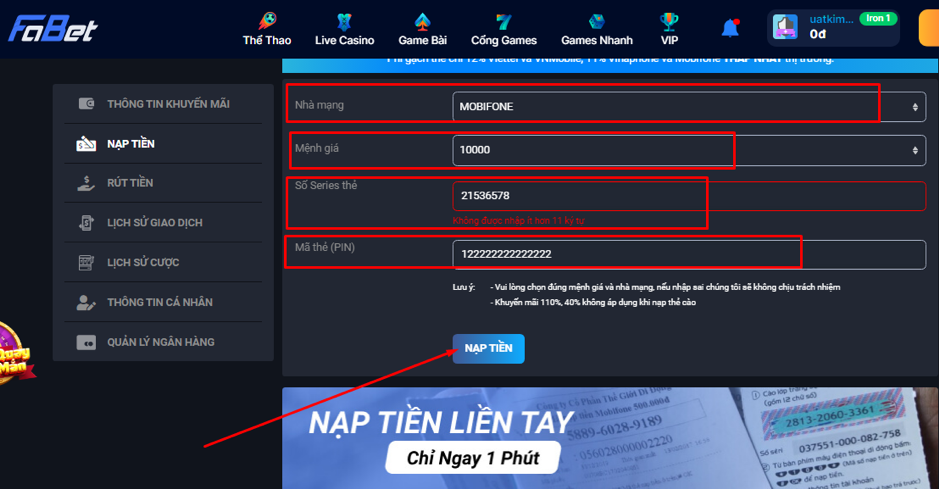 Lưu ý, gửi tiền bằng thẻ cào anh em sẽ không nhận được khuyến mãi 110% cũng như 40% từ nhà cái FaBet.