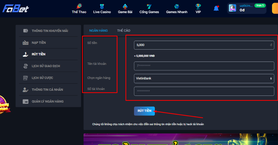 Theo kinh nghiệm chơi và rút tiền của tôi ở FaBet, cho đến nay nhà cái cũng chỉ hỗ trợ hai phương thức đó là: Ngân hàng và Thẻ cào. Để giúp anh em hiểu rõ hơn sau đây tôi sẽ hướng dẫn chi tiết các bước rút tiền.
