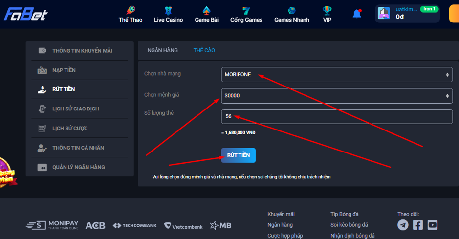 Đối với hình thức rút tiền FaBet thẻ cào, anh em điền thông tin theo biểu mẫu gồm nhà mạng, mệnh giá, số lượng thẻ rồi click vào ô Rút tiền để hoàn thành giao dịch.